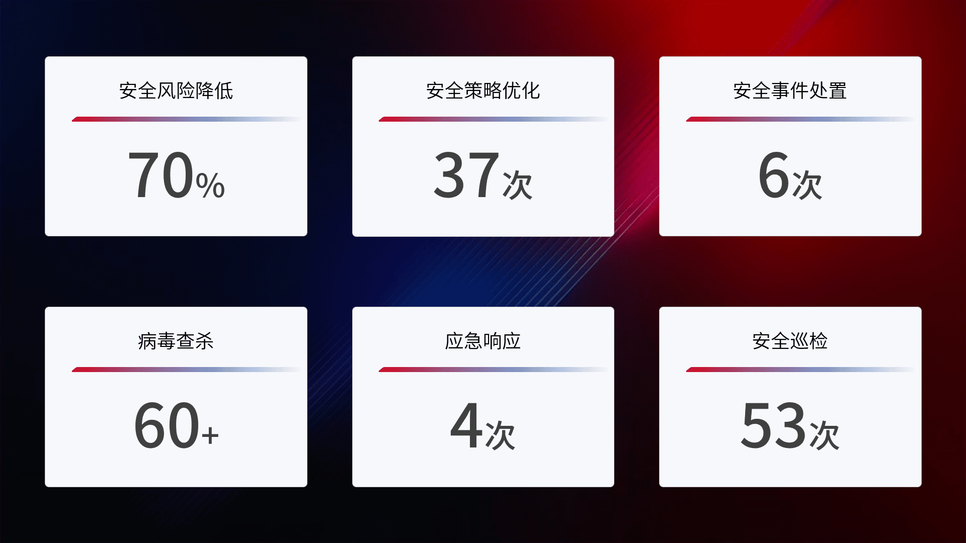 提供全面的安全事件报告体系,,,包括处置报告、、、、周报、、季度和年度总结,,,,结合持续监控,,帮助客户深入了解网络安全状况。。。。